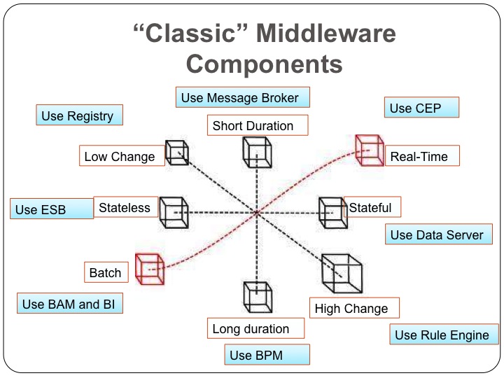 IMPORTANT LESSON: The point of all these components is that they systematize common enterprise functionality using best practices. If your development organization had to build a rule engine every time it wanted to implement a flexible rule somewhere it would take more time and would result in inconsistent capabilities. So having a general solution to the problem of handling stateful transactions, long business processes, short fast business transactions simplifies and makes higher quality results for enterprises.