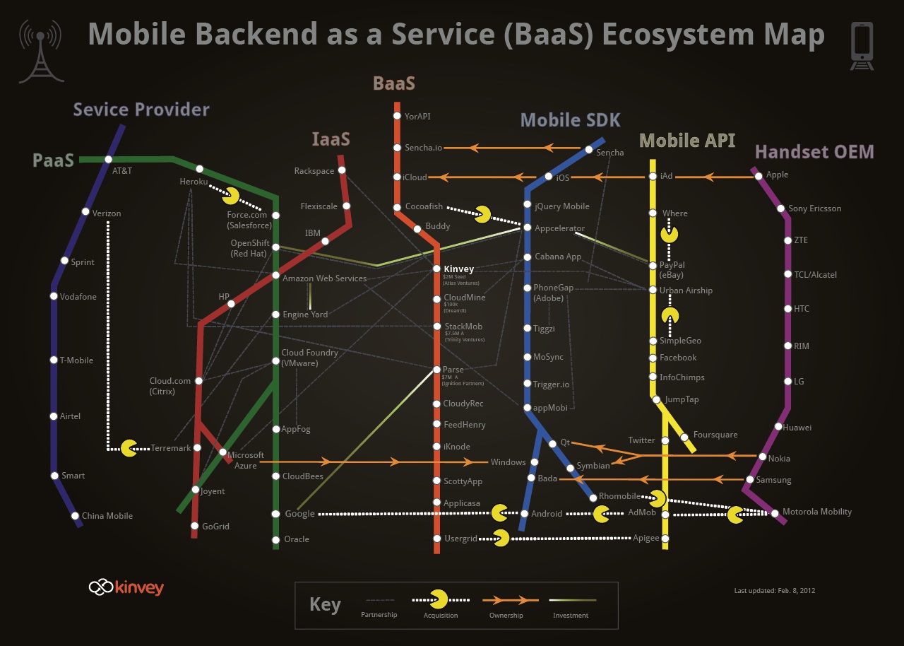 A complaint I heard from a CIO recently was that when talking to the high flying technologists at his firm he said: “they talked in strange names, Kafka this, docker that. Names of open source projects, APIs and languages that make him wonder if these people can program or just piece together technology and names? It’s very easy to toss around a lot of names and convince somebody you know what you are talking about, but the real question: If you assume that you can do things like this; Is this the way we should be building software these days? Talk to developers today and a lot are doing something different than what we did just a few years ago. Today developers may use languages such as Ruby or Scala, PHP or Clojure or combinations of these things in a single project, they may use google APIs and back end as a service APIs, Salesforce APIs and APIs for doing pattern discovery, blob storage. They may use Storm or Kafka, App Factory, CEP, Stratos, docker, node.js or cassandra or an open source Identity Management. They may develop on IntelliJ or CodeEnvy in the cloud. They may build their technology with dependency injection, aspect oriented techniques, test using Chaos Monkey, appium and numerous other web services that in general allow them to have very high productivity. It is very likely they will complain bitterly if you don’t have Git, Maven or Jenkins, Chef or Puppet and numerous other open source tools for them to use that they are familiar with. It’s a new world that has evolved very rapidly. This cacophony of names is scary for some. I love this diagram that Kinvey came up with some time ago that illustrates some of the complexity of just the APIs for backend as a service in the new paradigm: