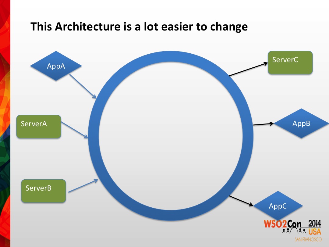 When you designed software back in the days it was a pretty much a “waterfall approach”. You could draw boxes and lines and show how everything connected as in the above left diagram. As Enterprise Architecture got more and more complicated many enterprises looked like the left diagram above. Since communication code is amongst the hardest code to write and everything was point to point any change was a big hassle. More importantly, software became extremely brittle. The slightest change required lots of changes in unrelated software and lots of testing to see if you didn’t break something.
