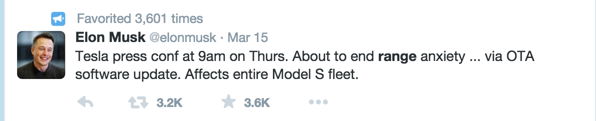 Elon Musk has said that on Thursday Morning 9AM PST he will announce elimination of range anxiety via an OTA (Over the Air) update to all Tesla owners.